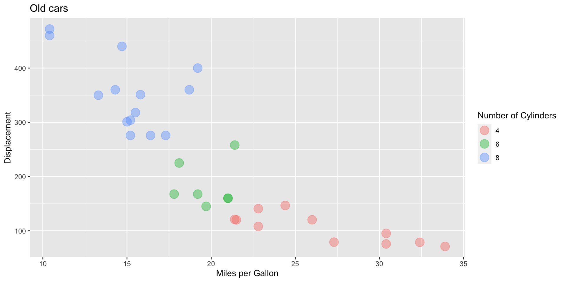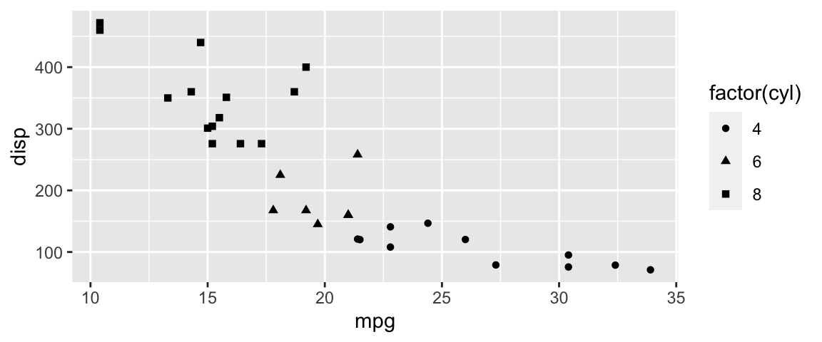 Rather than representing this information in distinct side-by-side plots, I may want to create a single plot and and distinguish the groups of 4, 6, and 8 cylinder cars using colours or shapes.