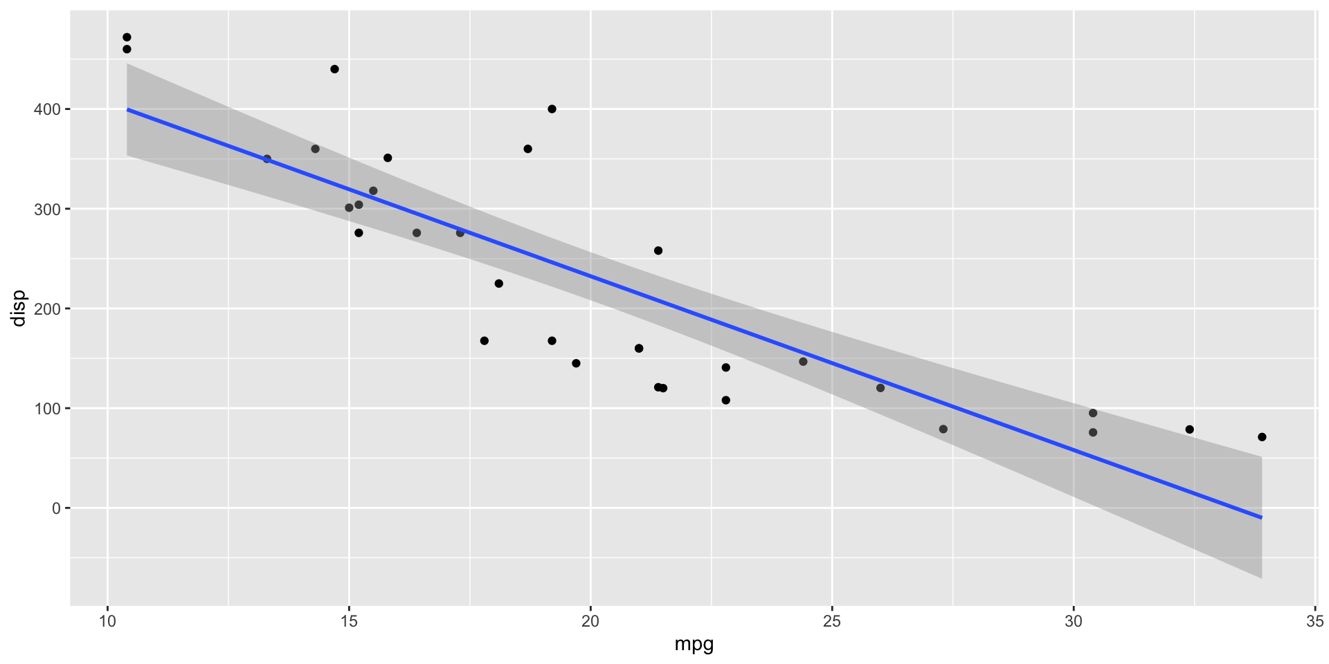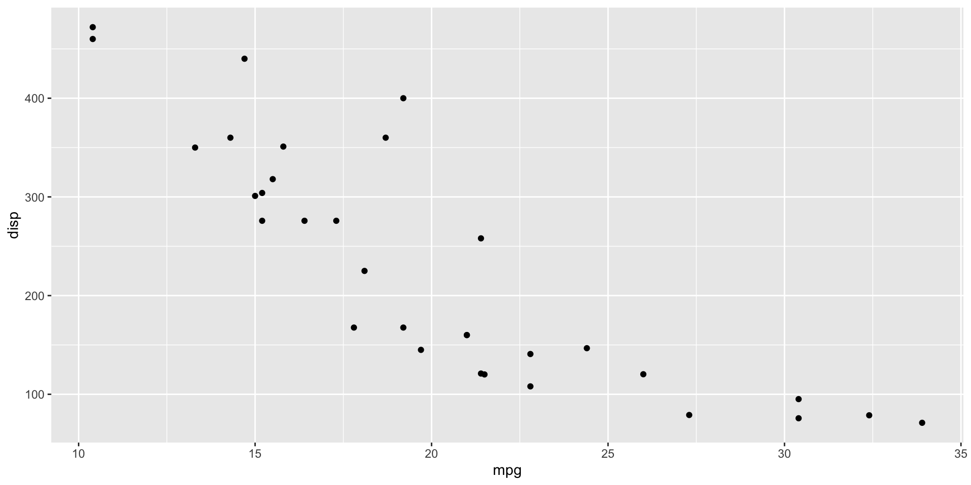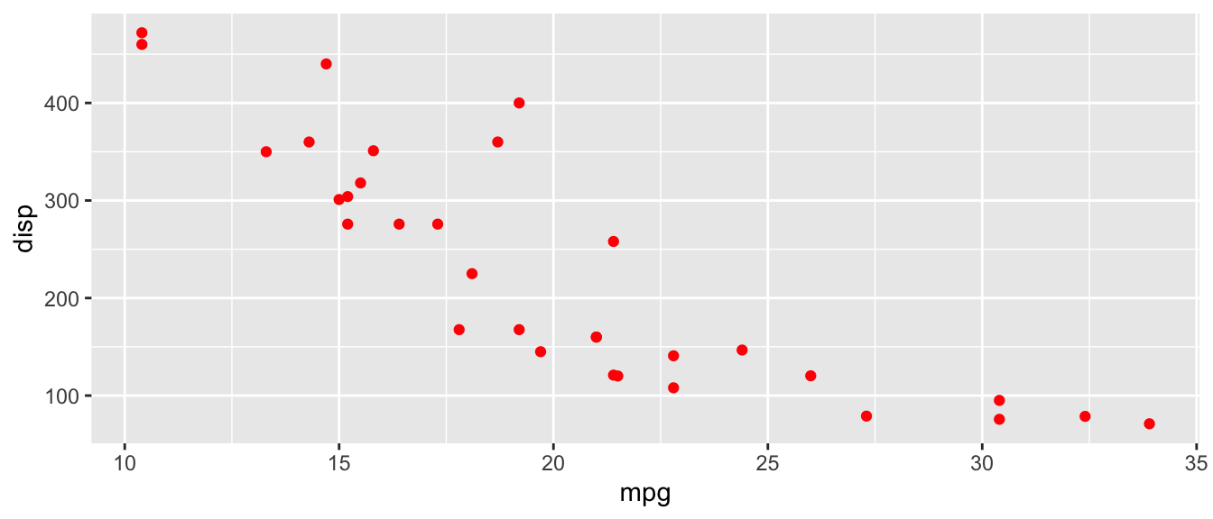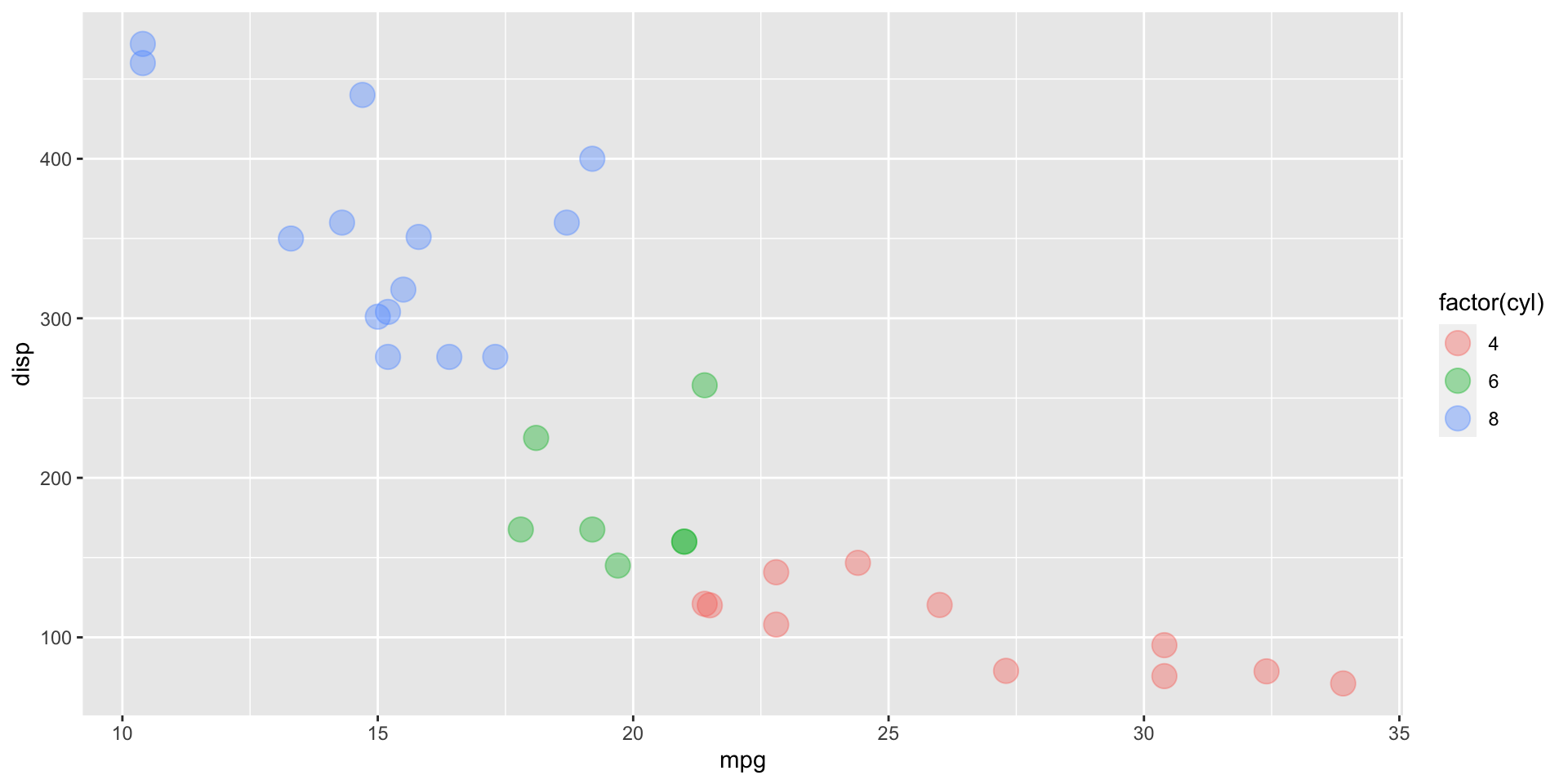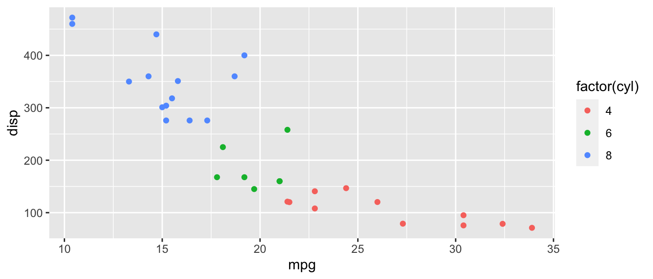 A scatter plot for mpg vs. disp (displacement) where points are coloured according to cyl type