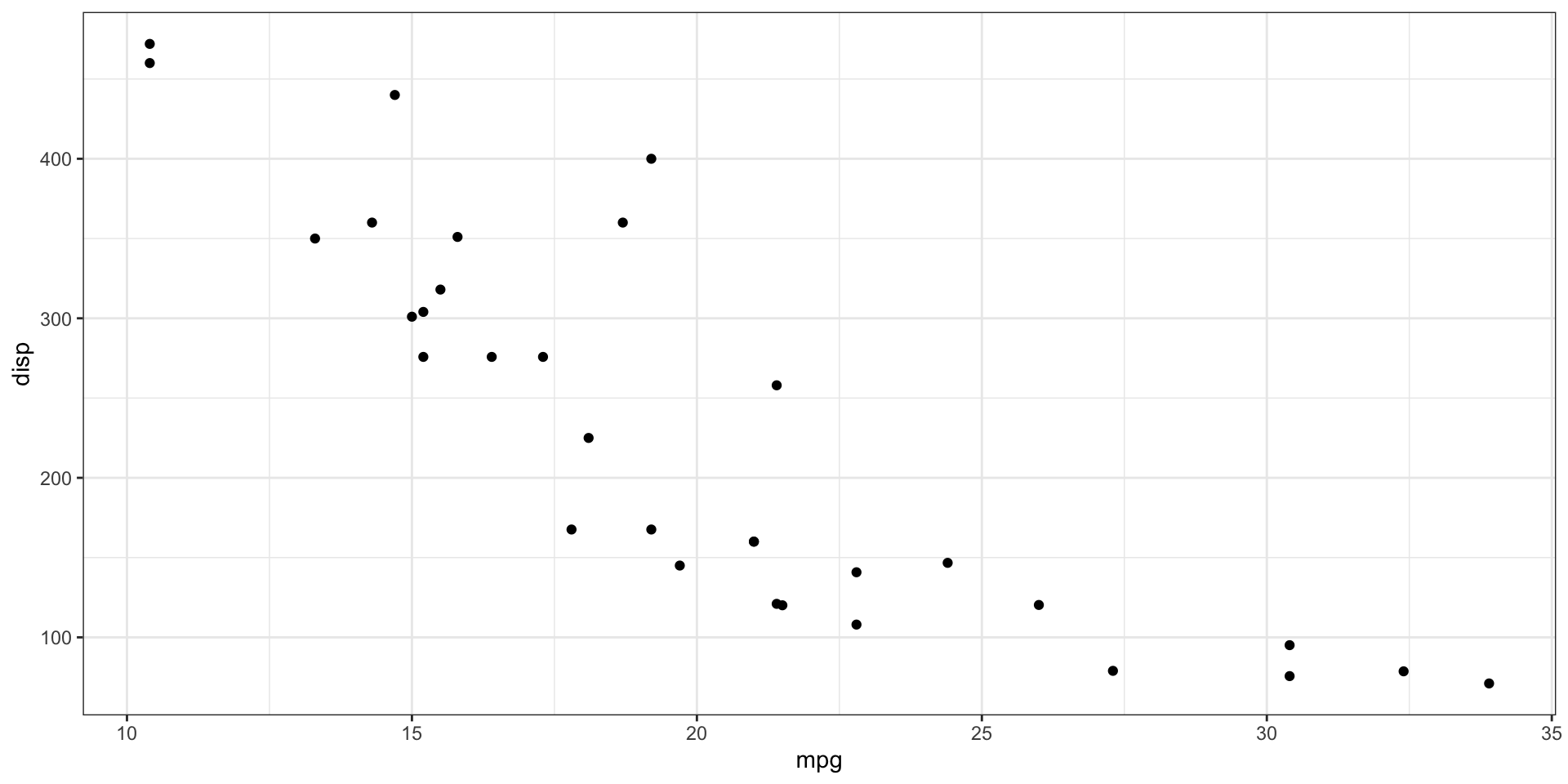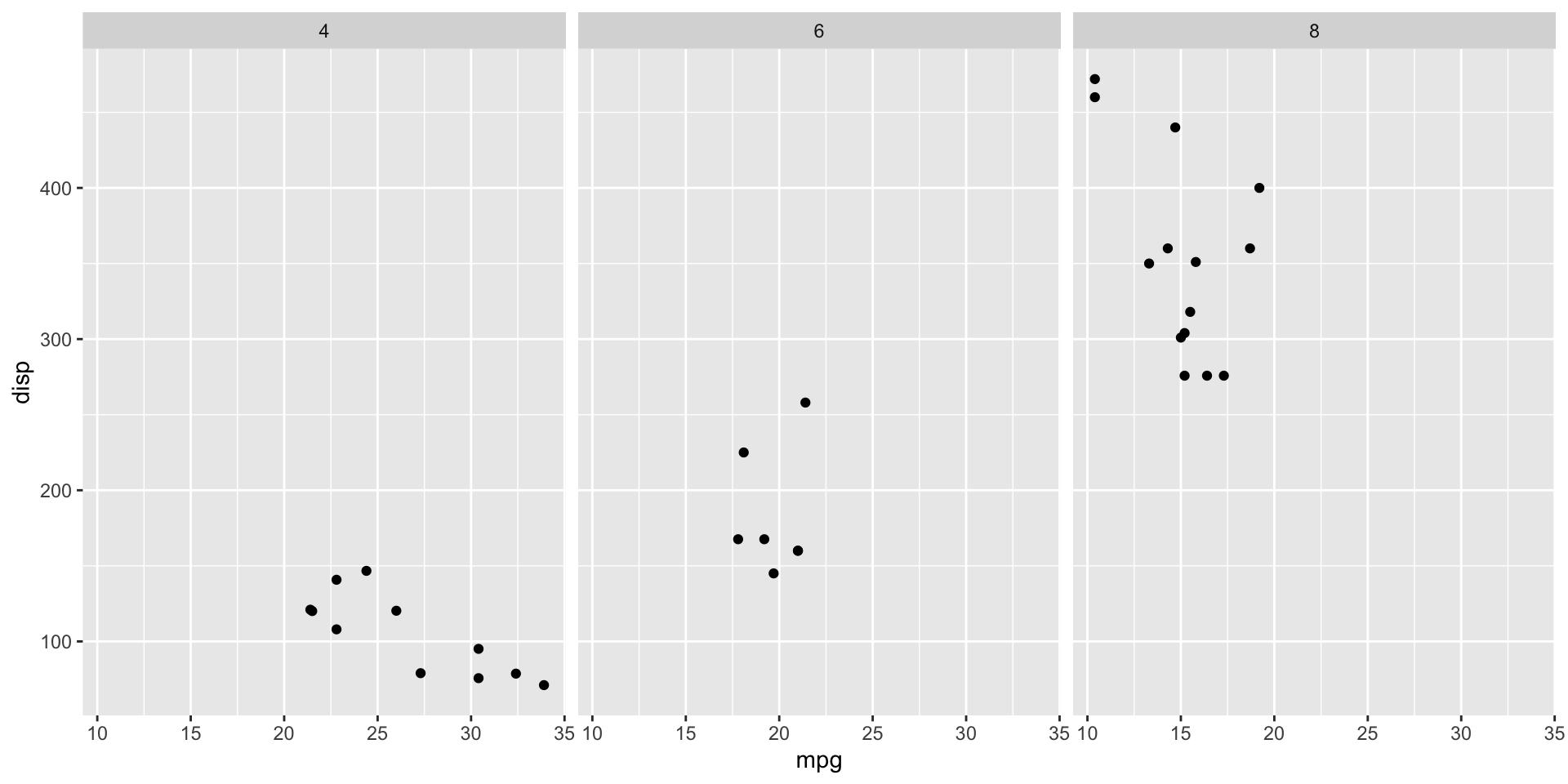 Let’s plot the side-by-side scatter plots for mpg (Miles/(US) gallon) vs. disp (Displacement (cu.in.)) for each cyl (Number of cylinders: 4, 6, 8) in the mtcars data set.