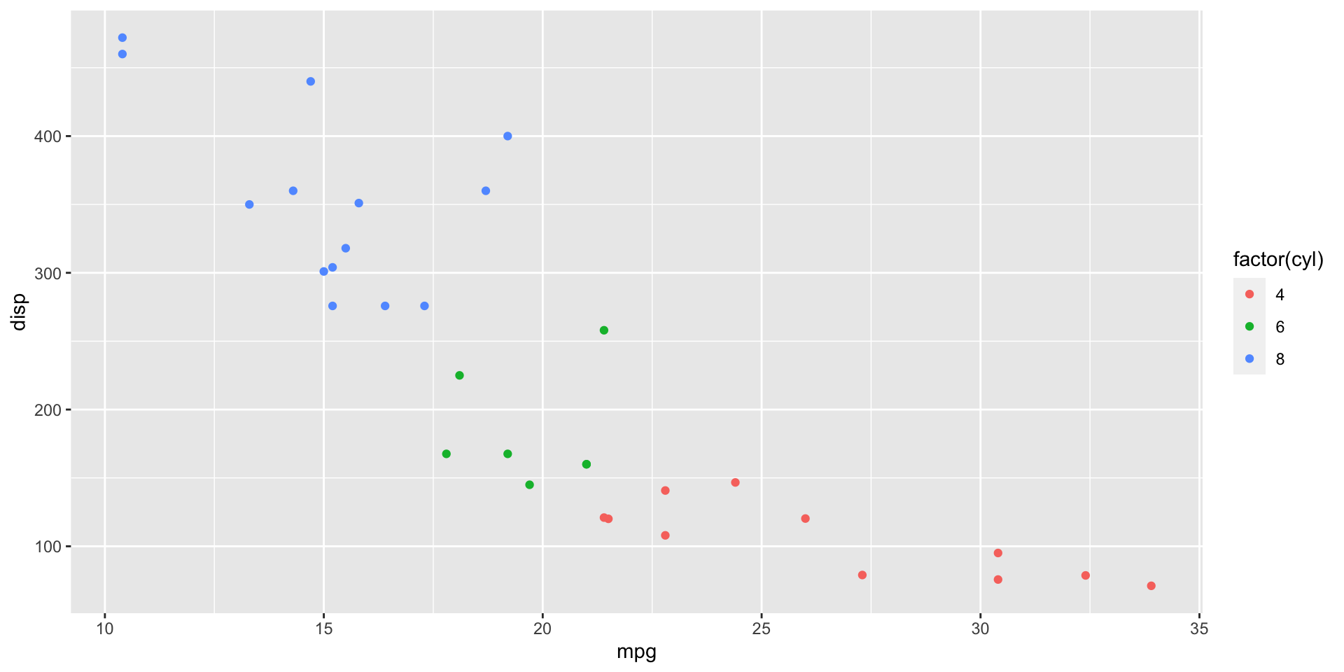 In ggplot2 terms, we could change the colour aesthetics (latter referenced as aes) according the to factor cyl.