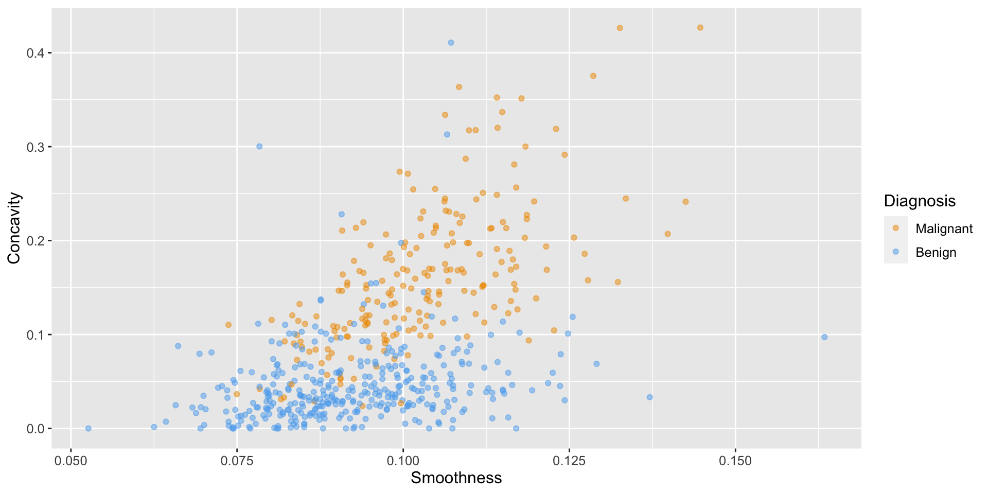 ggplot(aes(x = Smoothness, y = Concavity, color = Class)) +