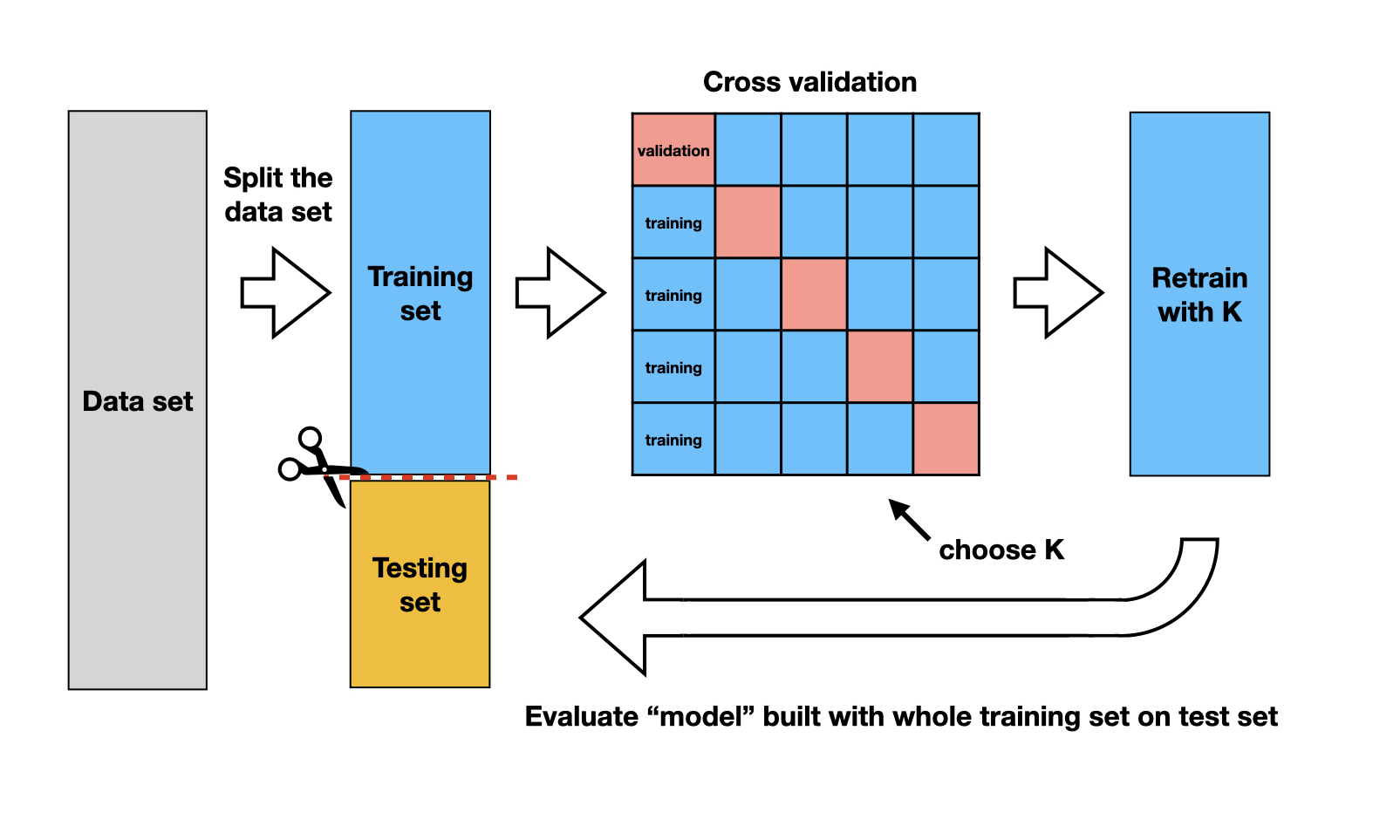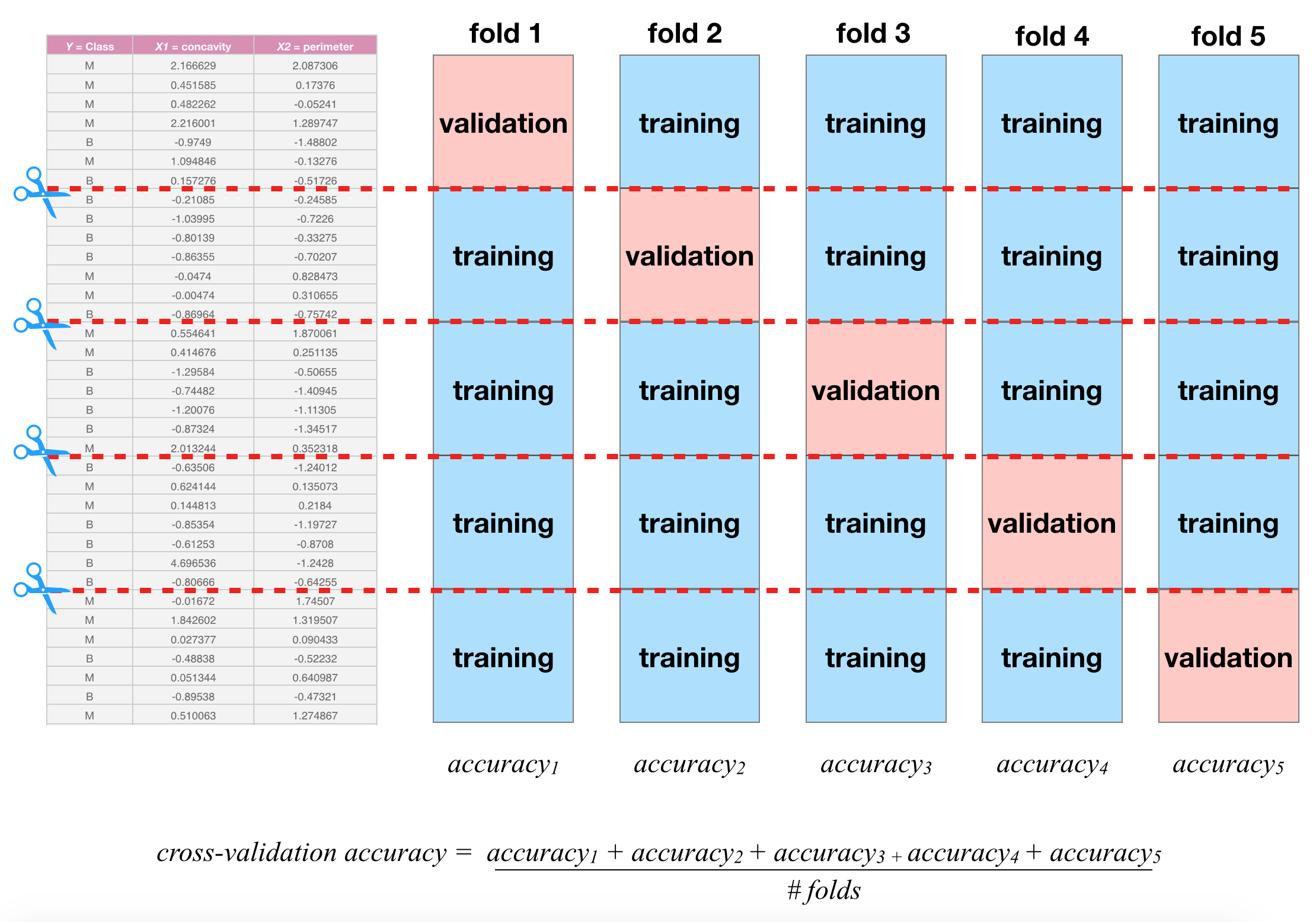 V-fold Cross-validation (CV) uses the same trick did before when evaluating our classifier, that is we will “hide” some data during the fitting process