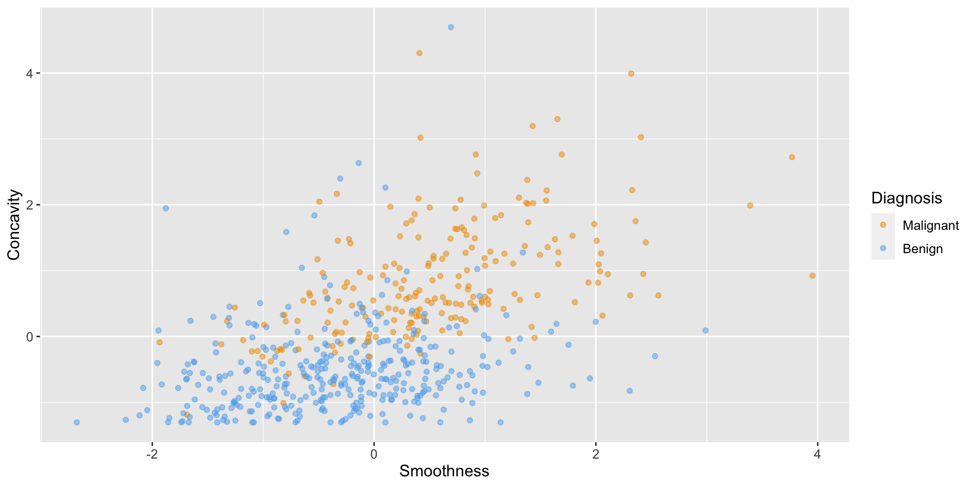 ggplot(aes(x = Smoothness, y = Concavity, color = Class)) +