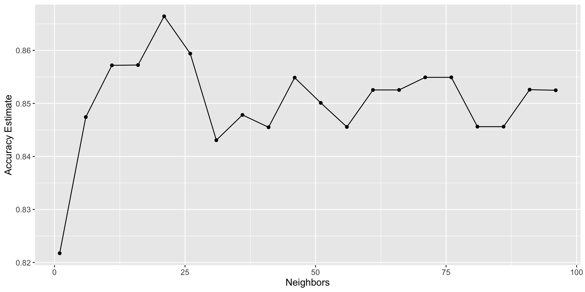 While we could conceivable, do all possible values from 1 to \(n\) (the number of observations in our training set), we will see that the optimal choice for K will come much earlier than \(n\) = 426.
