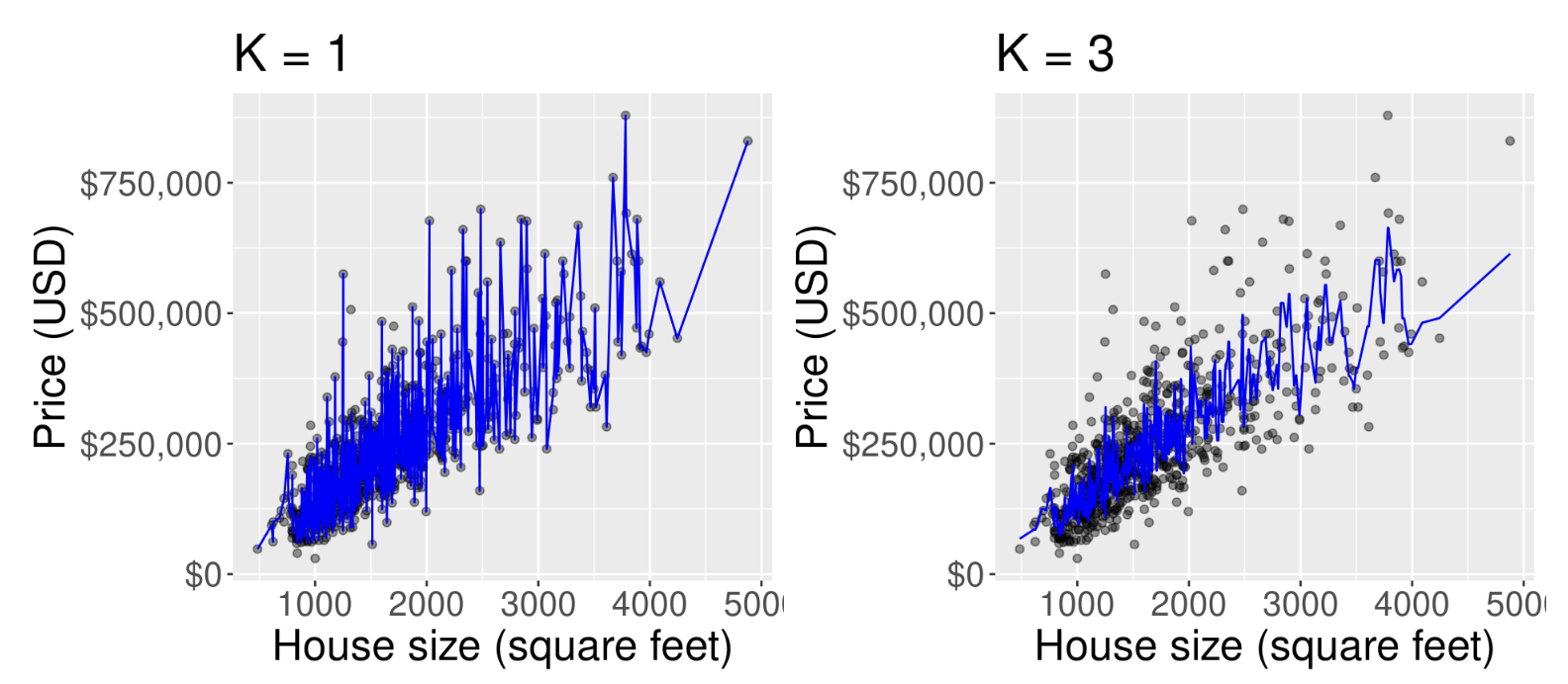 The predicted values for house sale price for a KNN regression model fitted on the training data with K = 1 (left) and K = 3 (right).