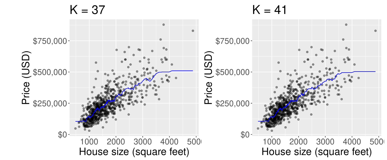 The predicted values for house sale price for a KNN regression model fitted on the training data with K = 37 (left) and K = 41 (right).