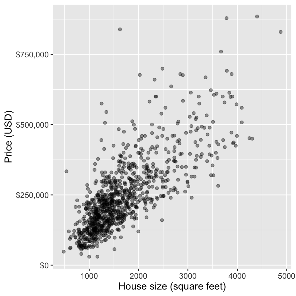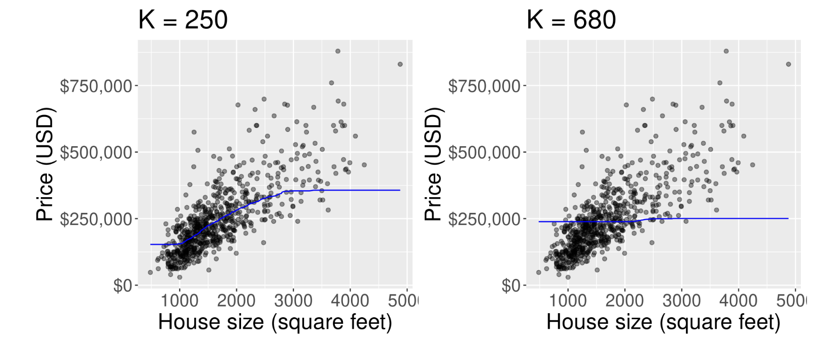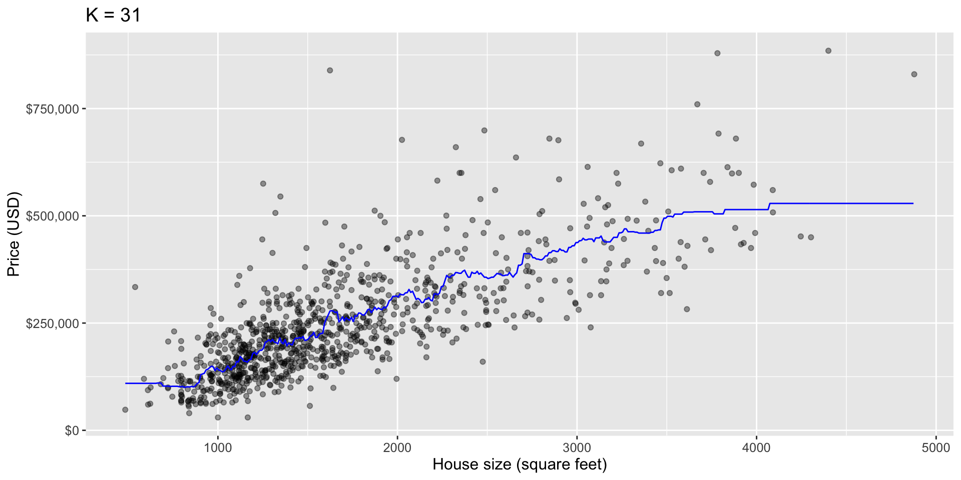# range of plausible house sizes sqft_prediction_grid <-tibble(sqft =seq(from = sacramento |>select(sqft) |>min(),to = sacramento |>select(sqft) |>max(),by =10 ))# predicted price of these hypothetical housessacr_preds <- sacr_fit |>predict(sqft_prediction_grid) |>bind_cols(sqft_prediction_grid)# scatter plot of price vs. square footageplot_final <-ggplot(sacramento, aes(x = sqft, y = price)) +geom_point(alpha =0.4) +# superimpose prediction line geom_line(data = sacr_preds, mapping =aes(x = sqft, y = .pred), color ="blue") +xlab("House size (square feet)") +ylab("Price (USD)") +scale_y_continuous(labels =dollar_format()) +ggtitle(paste0("K = ", kmin)) +theme(text =element_text(size =12))plot_final
