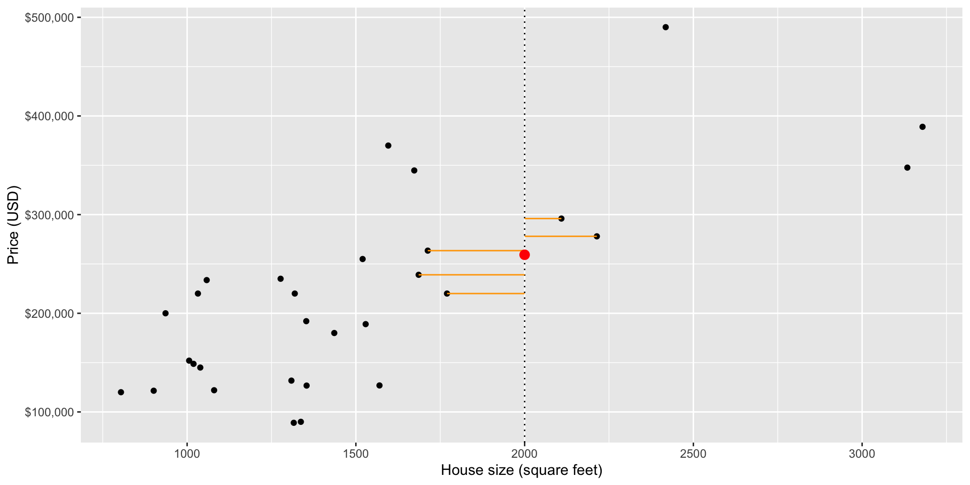 The predicted price for a house with 2000 square footage, is the average price of it’s five nearest neighbours: