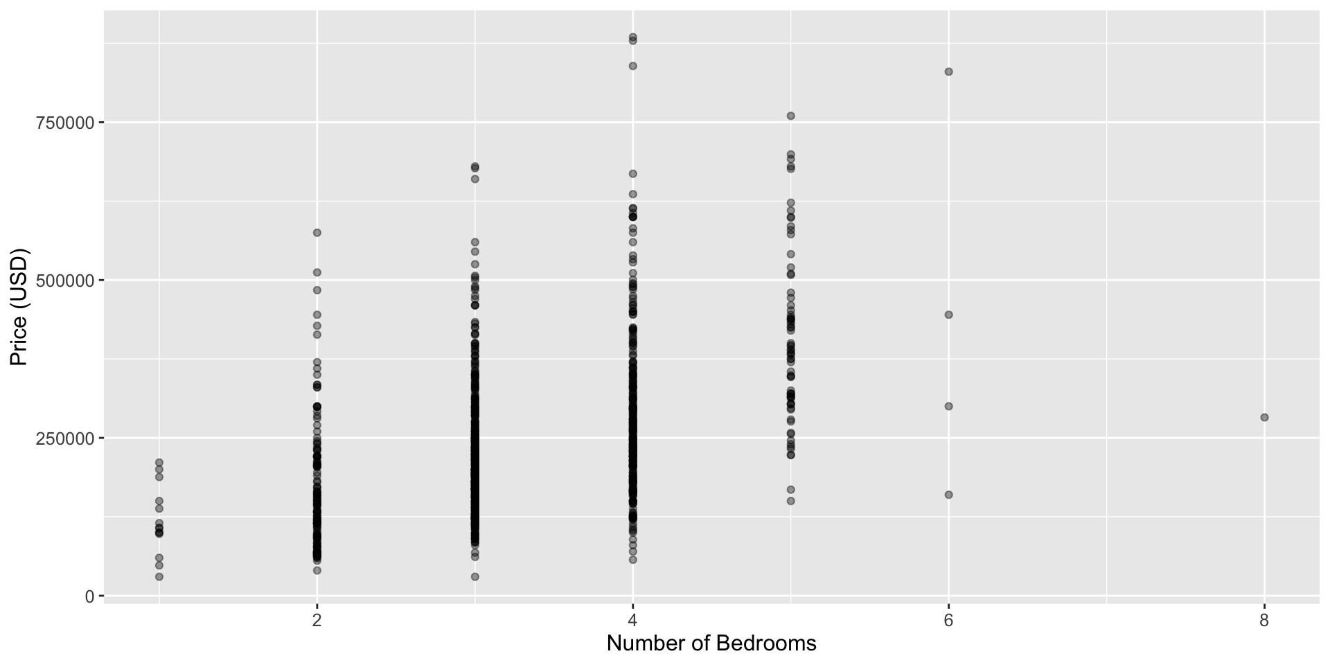 plot_beds <- sacramento |>ggplot(aes(x = beds, y = price)) +geom_point(alpha =0.4) +labs(x ='Number of Bedrooms', y ='Price (USD)') +theme(text =element_text(size =12))plot_beds