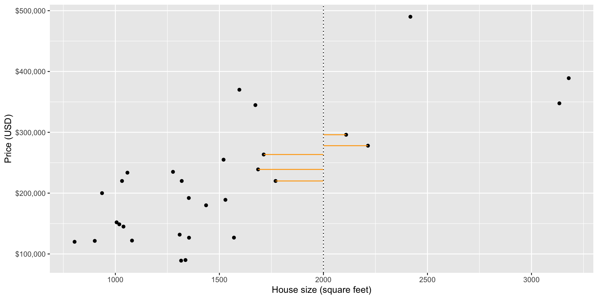 (nearest_neighbors <- small_sacramento |>mutate(diff =abs(2000- sqft)) |>slice_min(diff, n =5))
