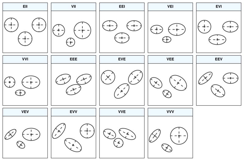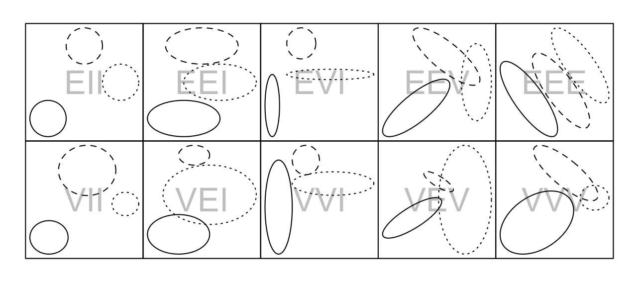 | VVV | 𝜆𝑘𝑫𝑘𝑨𝑘𝑫⊤𝑘 | Ellipsoidal | Variable | Variable | Variable |