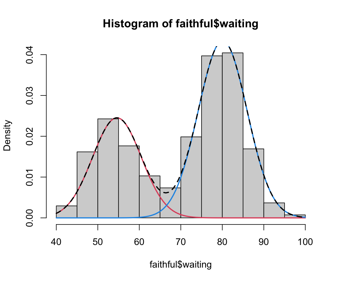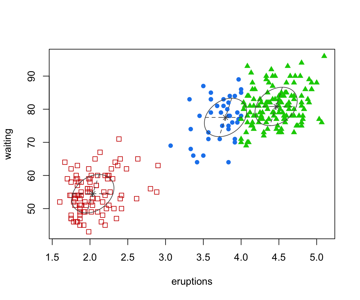 To see this in action, lets take a closer look at the MCLUST output when it was fit to our old faithful geyser data.
