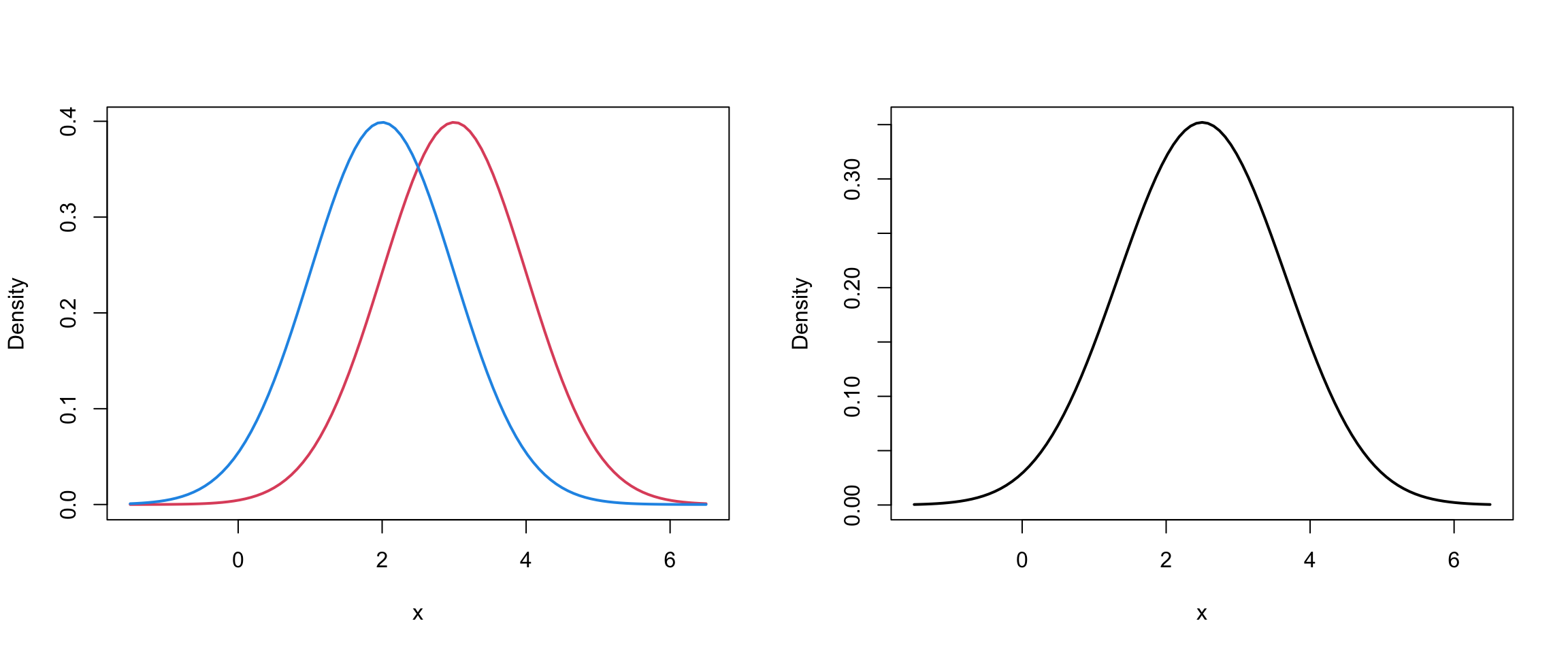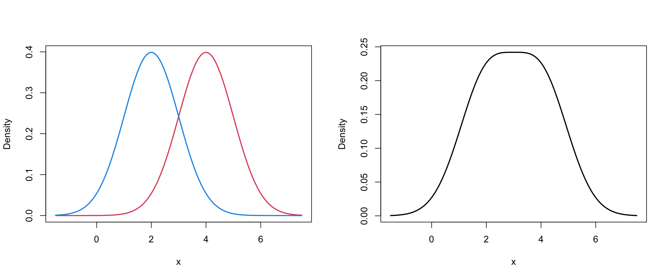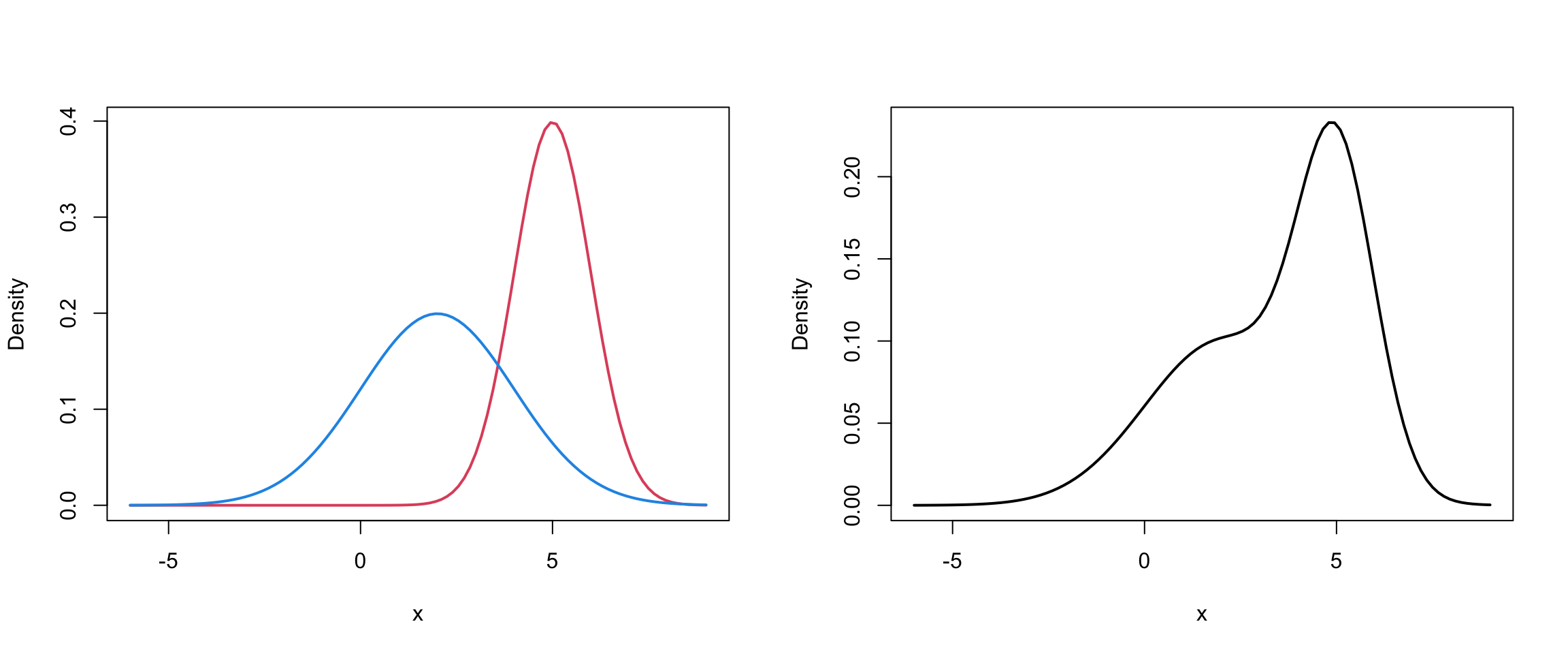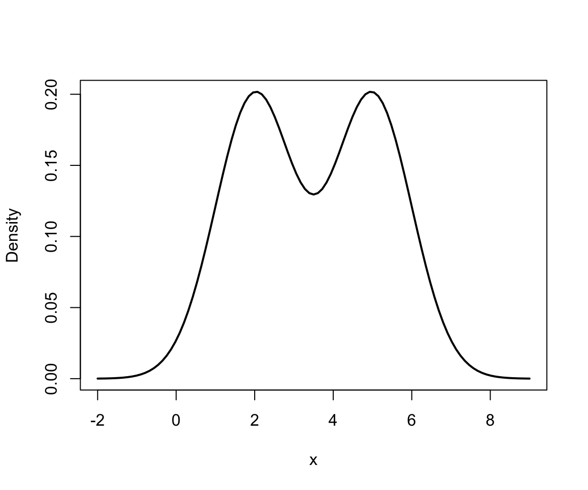 Mixture models are just a convex combination of statistical distributions. In general, for a random vector \(\mathbf{X}\), a mixture distribution is defined by \[f(\mathbf{x}) = \sum_{g=1}^G \pi_g p_g(\mathbf{x} \mid \theta_g)\] where \(G\) is the number of groups, \(0 \leq \pi_g \leq 1\) and \(\sum_{g=1}^G \pi_g = 1\) and \(p_g(\mathbf{x} \mid \theta_g)\) are statistical distributions with parameters \(\theta_g\).