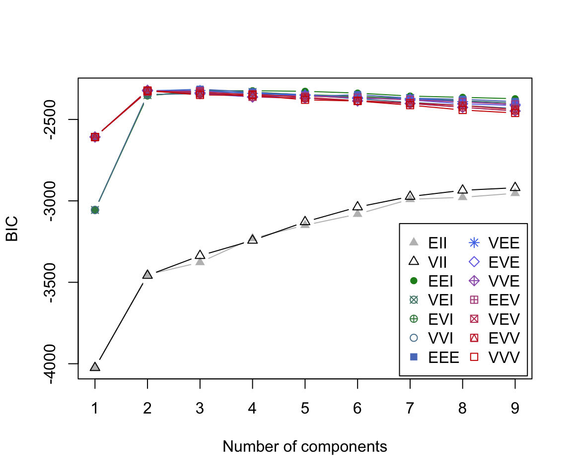 By default, MCLUST will fit a g-component mixture model for all 14 models models for \(g\) = 1, 2, … 9.
