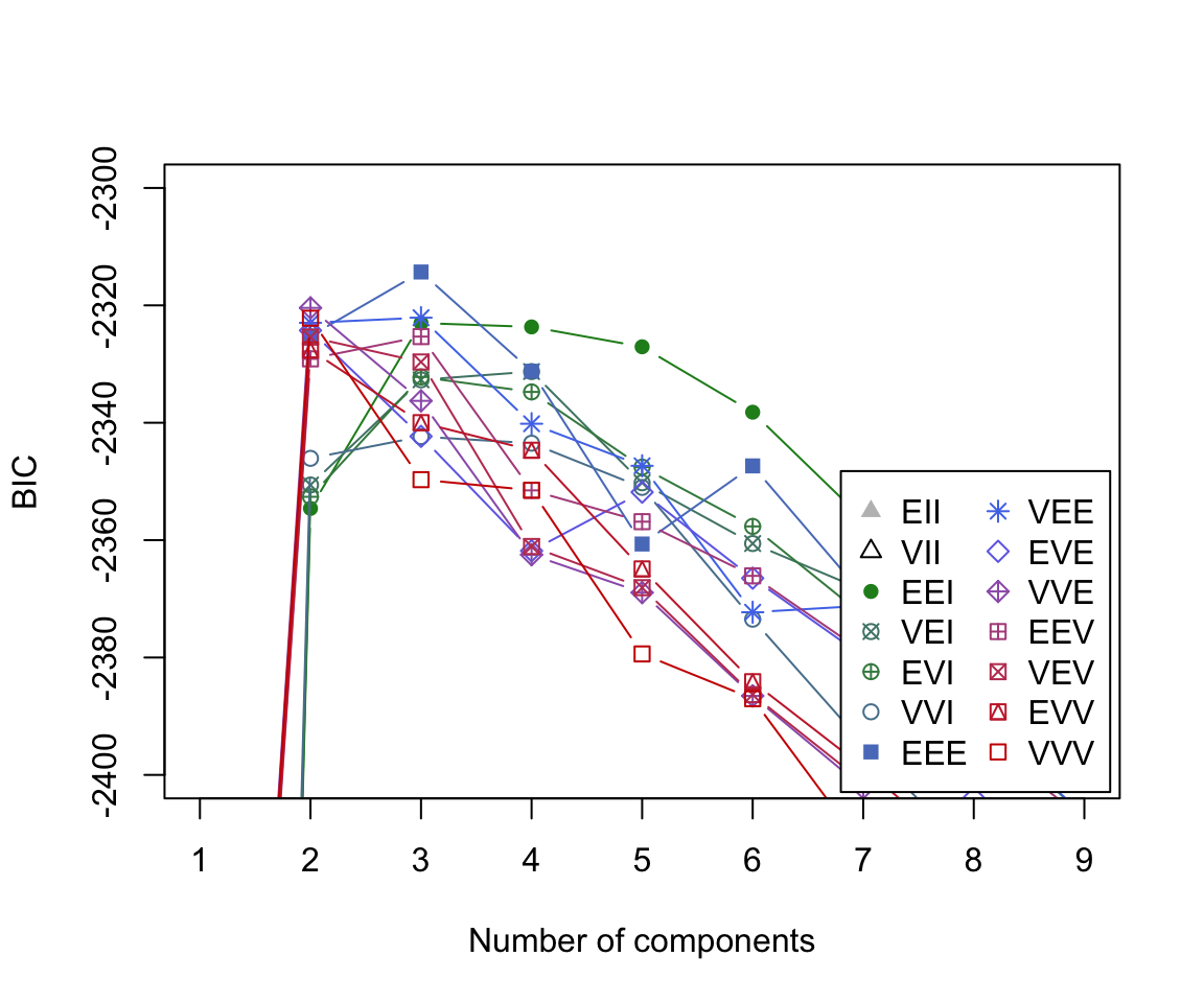 The BIC plot reveals that the model which obtains the largest BIC value is the 3-component mixture model with the ‘EEE’ covariance structure.